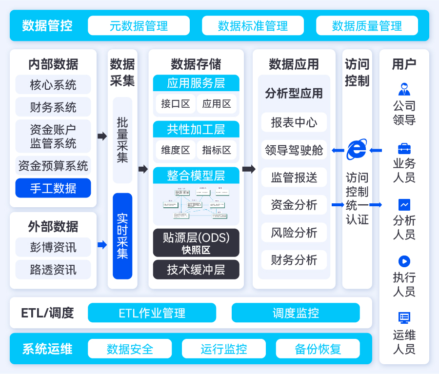建立離線采集和實(shí)時(shí)采集兩個(gè)通道,基于長(zhǎng)亮科技“數(shù)據(jù)交換平臺(tái)”、“數(shù)據(jù)補(bǔ)錄平臺(tái)”、“外部數(shù)據(jù)管理平臺(tái)”實(shí)現(xiàn)業(yè)務(wù)結(jié)構(gòu)化數(shù)據(jù)、線下手工臺(tái)賬數(shù)據(jù)、集團(tuán)數(shù)據(jù)以及工商、稅務(wù)等外部數(shù)據(jù)采集存儲(chǔ),逐步將合同、憑證等非結(jié)構(gòu)化數(shù)據(jù)納入數(shù)據(jù)平臺(tái)管理,實(shí)現(xiàn)數(shù)據(jù)統(tǒng)一采集、統(tǒng)一存儲(chǔ)、統(tǒng)一加工,為打破數(shù)據(jù)孤島,實(shí)現(xiàn)數(shù)據(jù)橫向貫通、縱向穿透奠定基礎(chǔ);