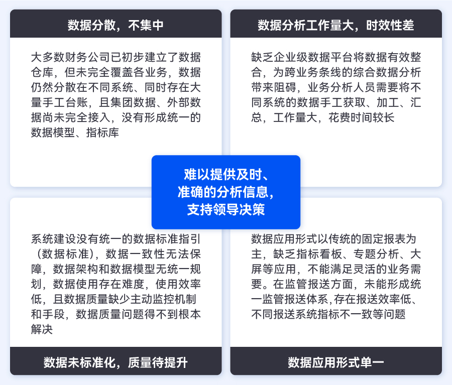 2022年2月國(guó)務(wù)院國(guó)資委發(fā)布了《關(guān)于中央企業(yè)加快建設(shè)世界一流財(cái)務(wù)管理體系的指導(dǎo)意見(jiàn)》,《意見(jiàn)》高度重視“完善智能前瞻的財(cái)務(wù)數(shù)智體系”,要求各企業(yè)統(tǒng)一數(shù)據(jù)規(guī)范,避免數(shù)據(jù)孤島、維護(hù)數(shù)據(jù)資產(chǎn)、激活數(shù)據(jù)價(jià)值。“數(shù)據(jù)”已成為財(cái)務(wù)數(shù)字化轉(zhuǎn)型的核心資產(chǎn)要素,但相較于商業(yè)銀行,財(cái)務(wù)公司受制于起步晚、業(yè)務(wù)性質(zhì)不同等因素,大數(shù)據(jù)能力建設(shè)客觀上仍然存在不小的差距,主要體現(xiàn)在以下方面: