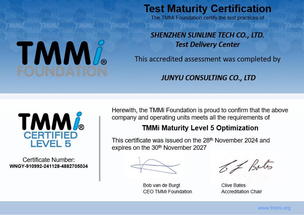 TMMi(Test Maturity Model Integration,測試成熟度模型集成)作為國際公認的測試管理體系構(gòu)建和測試過程改進權(quán)威評估標準,旨在支持世界各地的組織改進其軟件和系統(tǒng)測試成熟度,其認證體系涵蓋了從需求分析、設(shè)計開發(fā)、項目管理直至產(chǎn)品交付的全生命周期管理,是企業(yè)軟件產(chǎn)品質(zhì)量管理水平最有力的資質(zhì)證明。TMMi認證共分為五個成熟度級別,其中5級是對測試組織成熟度的最高認證。