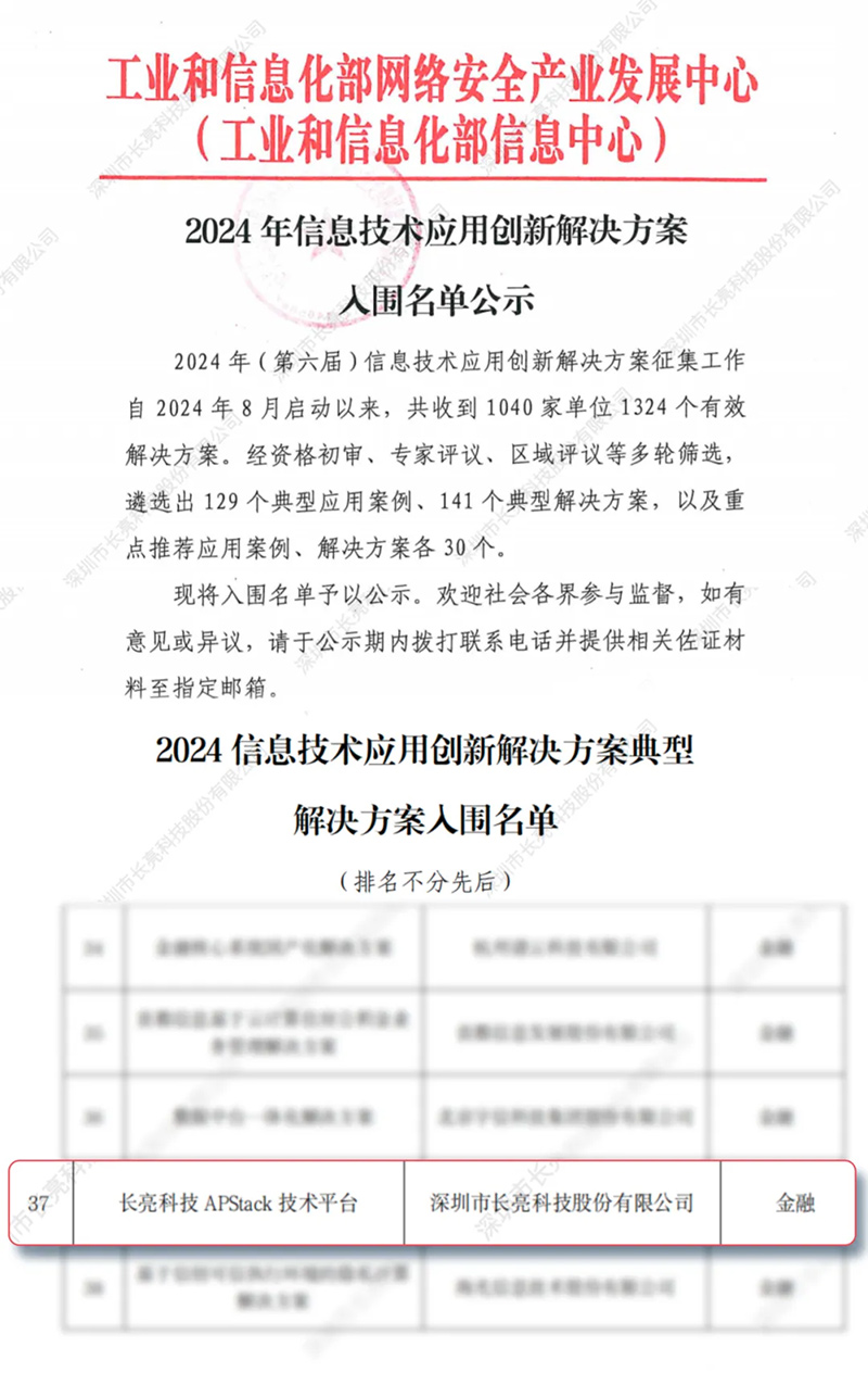 國家級榜單!長亮科技APStack平臺入選工信部2024年信息技術應用創新解決方案