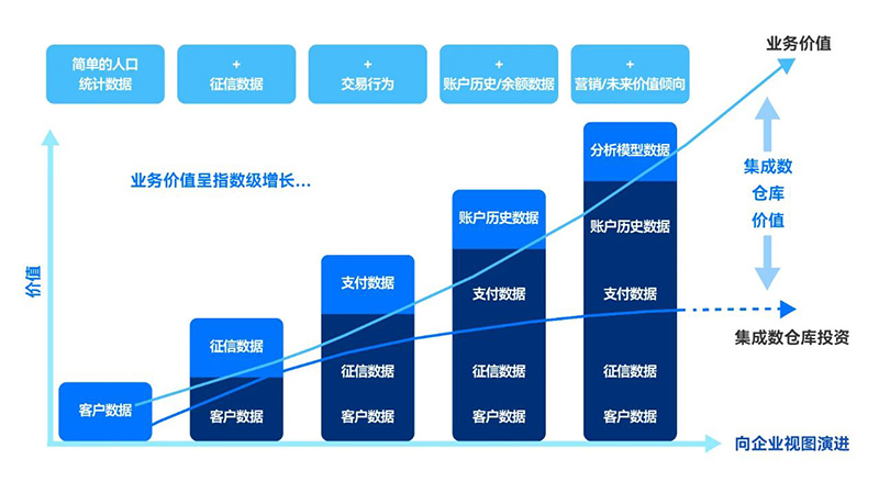 來自于高度的數(shù)據(jù)集成 彼得·德魯克說過,效率致力于正確地做事,效果則是做正確的事。 在數(shù)據(jù)倉(cāng)庫(kù)20多年的發(fā)展過程中,不同供應(yīng)商與用戶角色專業(yè)人員對(duì)數(shù)據(jù)集成的理解與認(rèn)識(shí)存在很大差異,大多停留在表面的粗淺理解中,或故意忽略或回避“數(shù)據(jù)集成”的本質(zhì),既不能正確地做事,也不能做正確的事,數(shù)據(jù)集成的成熟度沒有得到質(zhì)的提升。 代表高質(zhì)量數(shù)據(jù)的完整性來自數(shù)據(jù)的高度集成。中文語(yǔ)境下的“整合”概念,并不能覆蓋英文語(yǔ)境“集成”概念的豐富內(nèi)涵。英文語(yǔ)境中集成與完整性詞根相同,可以說數(shù)據(jù)集成的本質(zhì)目標(biāo)是實(shí)現(xiàn)數(shù)據(jù)的完整性,有清晰的標(biāo)準(zhǔn)要求。把多個(gè)數(shù)據(jù)源以通用格式存儲(chǔ)到數(shù)據(jù)湖中,然后轉(zhuǎn)換為目標(biāo)物理模型結(jié)構(gòu)的數(shù)據(jù),存儲(chǔ)在相同的數(shù)據(jù)模型中,還不是完整的數(shù)據(jù)集成。 數(shù)據(jù)集成在邏輯數(shù)據(jù)建模過程中需要開展以下設(shè)計(jì)工作: 圖2:業(yè)務(wù)價(jià)值隨持續(xù)集成的數(shù)據(jù)增長(zhǎng)