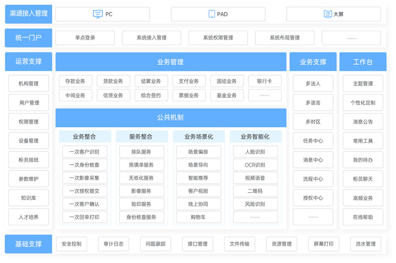 定位于面向場(chǎng)景設(shè)計(jì)的、能夠支撐銀行網(wǎng)點(diǎn)一體化信息建設(shè)的新型應(yīng)用平臺(tái),設(shè)計(jì)上以客戶(hù)為中心,以智能化、高效運(yùn)營(yíng)、業(yè)務(wù)統(tǒng)一化為目標(biāo),同時(shí)整合網(wǎng)點(diǎn)內(nèi)外所有人、設(shè)備和系統(tǒng),將業(yè)務(wù)流程打通,面向客戶(hù)進(jìn)行數(shù)據(jù)共享,做到一次識(shí)別、一次驗(yàn)證、一次確認(rèn)、一次打印,助力銀行提高客戶(hù)體驗(yàn)度、提升柜員作業(yè)效率、降低網(wǎng)點(diǎn)操作風(fēng)險(xiǎn),全面提升網(wǎng)點(diǎn)的營(yíng)銷(xiāo)能力和服務(wù)能力。