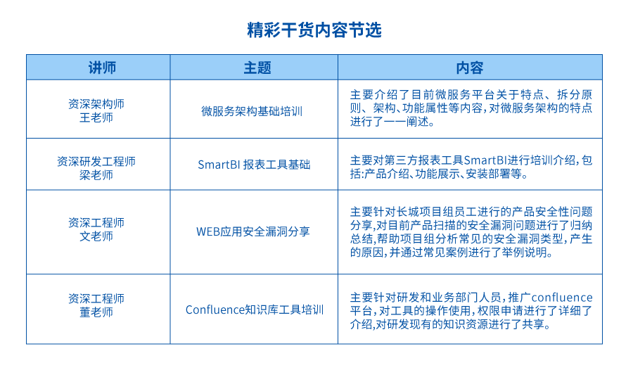 本期課程精心挑選18位專業(yè)講師,均為金融科技領(lǐng)域身經(jīng)百戰(zhàn)多年的專業(yè)性人才,是名副其實(shí)的長(zhǎng)亮科技主力軍,涉及Java開發(fā)、運(yùn)維、Web、研發(fā)等工程師及架構(gòu)師等。