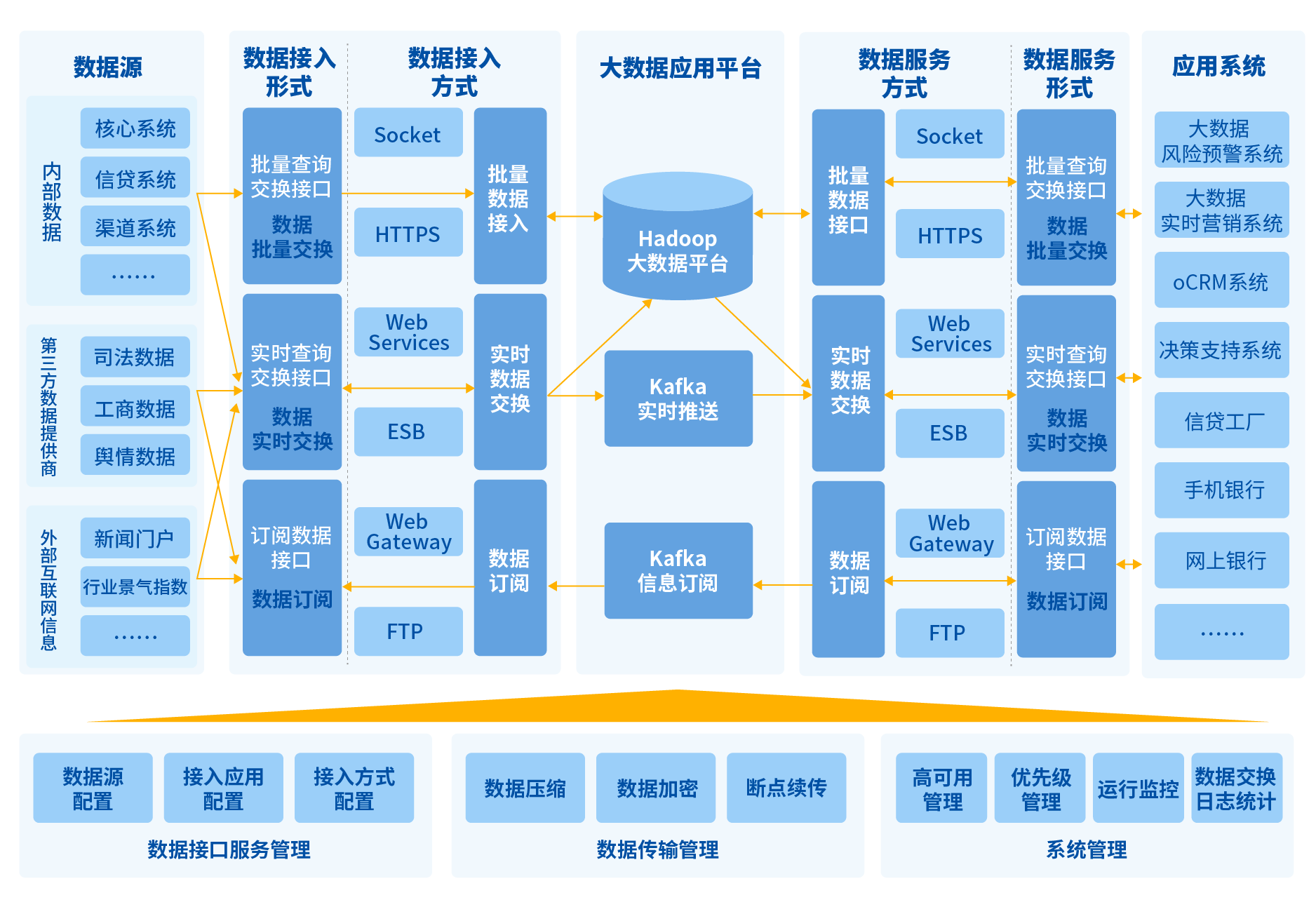 長亮科技企業級數據網關平臺(SunEDH)產品定位為全行內部數據和外部數據的接入、傳輸、交換、共享與服務的中心,是提升大數據平臺價值的基礎性平臺。