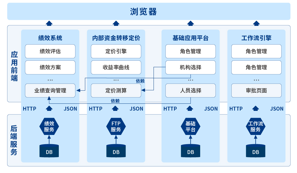 上圖中表明,基礎應用平臺的“機構選擇”和“人員選擇”功能,可以作為公共功能抽取出組件,發布到私服,由“績效系統”“內部資金轉移定價”等系統使用。 績效系統中的“業務查詢管理”依賴“基礎應用平臺”的功能完成,內部資金轉移定價中的“定價測算”也是依賴“基礎應用平臺”功能。