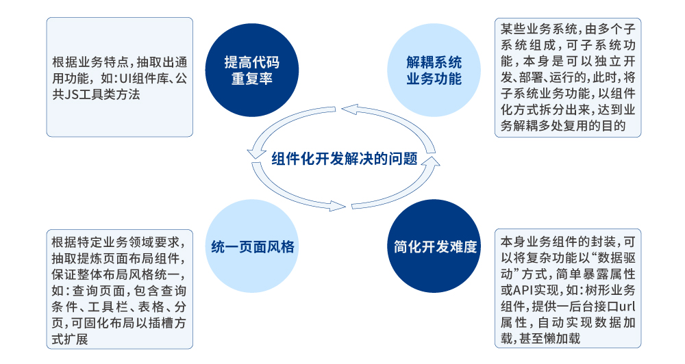 將公司各業務系統公共功能抽取出來,形成統一的組件,以便節約人力開發成本和維護成本。使用前端框架的插件腳手架工程,可以快速搭建一組件化插件工程,將組件功能發布成可以使用“模板依賴”的方式,組件搭配使用。