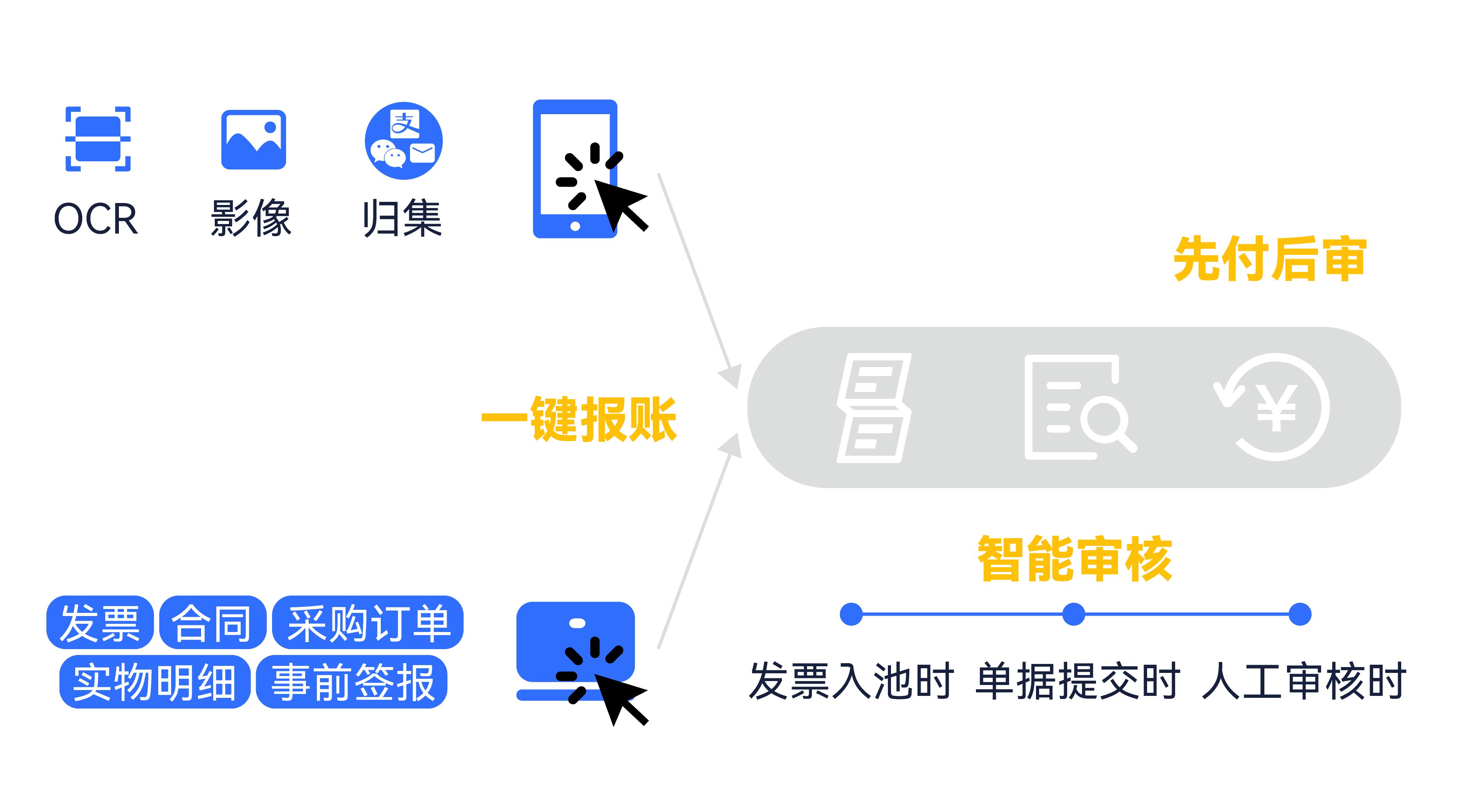 當員工需要提交報銷單據時,只需通過手機或掃描儀對原始發票進行影像獲取,系統將對其進行智能OCR識別,并同步完成四合一處理,實現“拍照即報銷”。